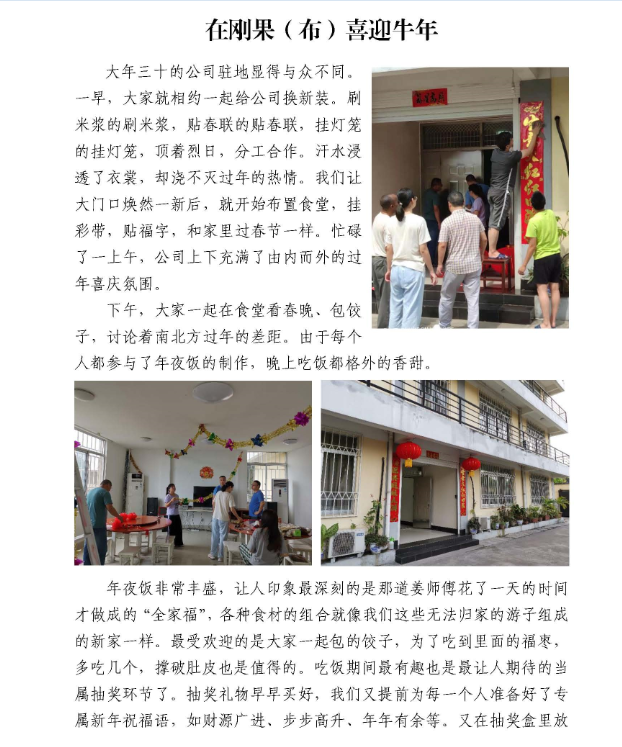 春節(jié)期間,公司駐外員工堅(jiān)守一線,30多個(gè)工程項(xiàng)目仍在有序推進(jìn),800多名建設(shè)者們把工地當(dāng)家,在異國(guó)它鄉(xiāng)的平凡崗位上書寫不凡。當(dāng)然,在這個(gè)全球華人同喜共慶的歡樂時(shí)刻,大家也不忘貼對(duì)聯(lián)、掛燈籠、畫年畫,聚在一起吃頓熱騰騰的年夜飯,其樂融融地觀看春晚。有的項(xiàng)目組還給大家準(zhǔn)備了新春禮物,有的舉辦了趣味盎然的慶?;顒?dòng)······。下面,就讓我們一起來感受一下他們的別樣“年味”。
