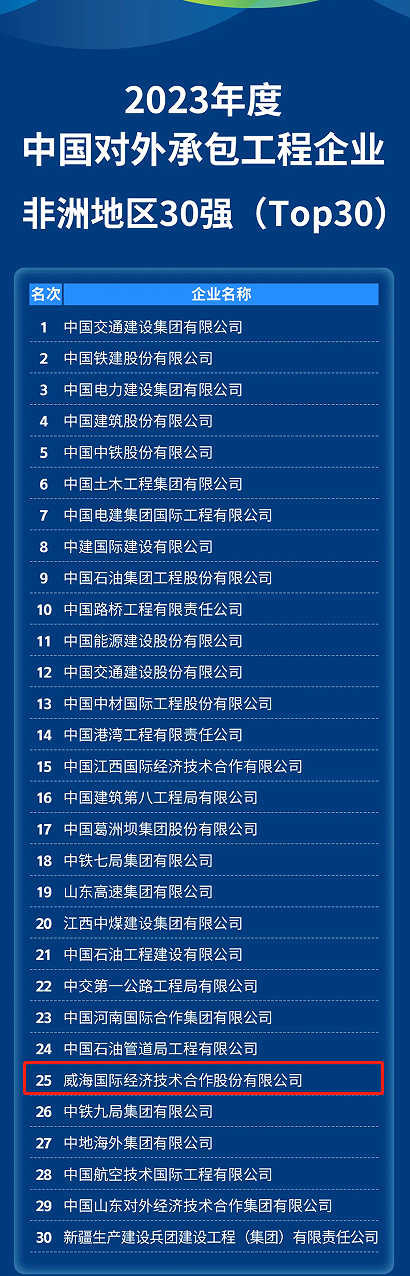 On May 7, during the 2024 China International Contracting Conference & Development Forum, China International Contractors Association released several rankings of China’s international contracting enterprises in 2023. Weihai International Economic & Technical Cooperative Co., Ltd (WIETC) was successfully listed among the Top 100 International Contracting Enterprises, the Top 30 Housing Construction Enterprises and the Top 30 Enterprises for Africa Business, ranking 65th, 25th and 25th respectively, which once again reflects the company's growing strength in overseas development.China's top 100 international contracting enterprises