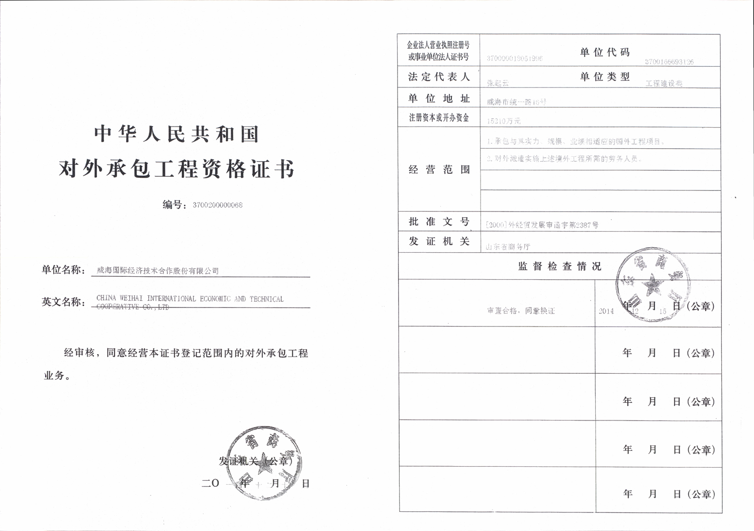 Tous droits réservés.:Weihai International Economic & Technical Cooperative Co.,Ltd(c)N°16, rue de Tongyi, ville de Weihai, Chine 魯ICP備12002982號-3 Tél:86-0631-5233588 Fax:86-0631-5224345 魯公網安備 37100202000269號 Soutien technique: