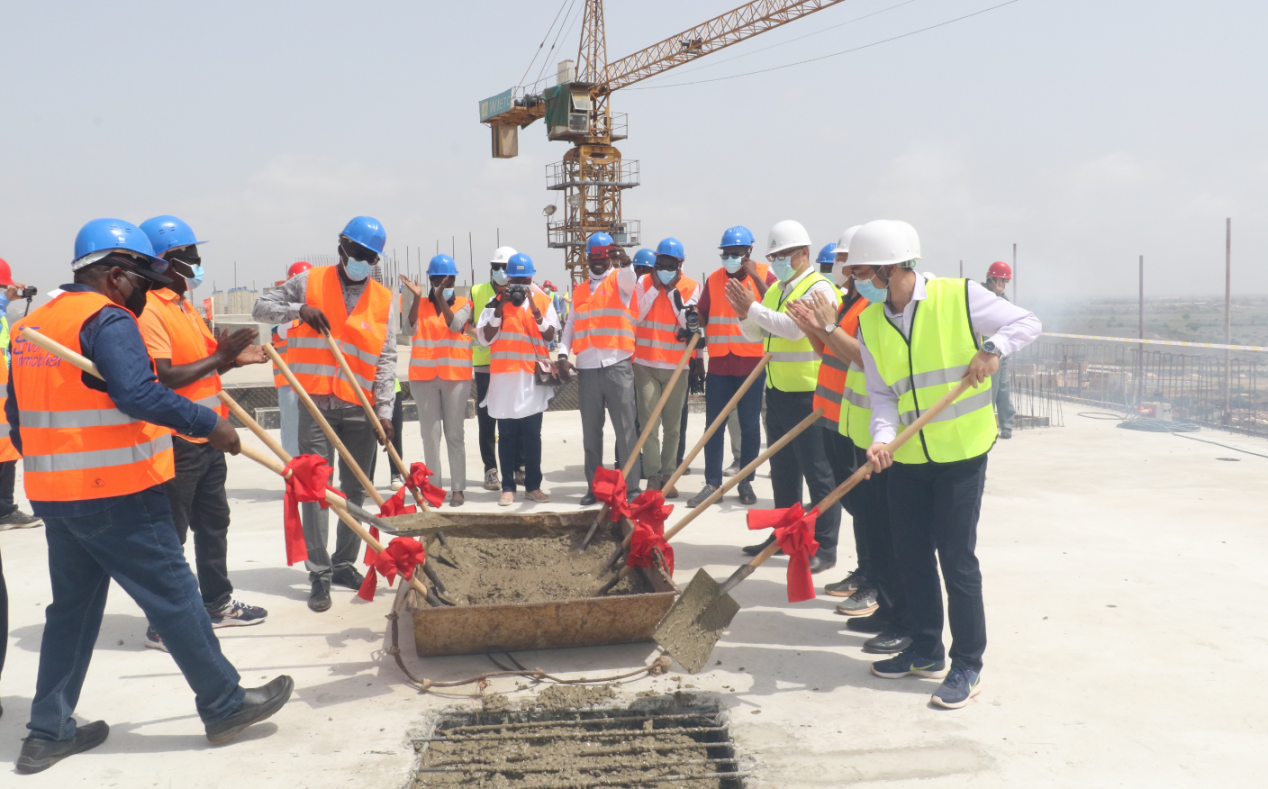 Le 15 juillet 2021 à 11h38, avec la dernière injection de béton sur la toiture de l'étage R+7 de la zone 2 du batiment C, la mise en place du couronnement du projet de batiment de bureau de l'Organisation des Nations Unies au Sénégal a été effectuée favorablement. Les pétards ont éclaté ensemble sur site du projet avec la salve d'applaudissements, les acclamations des employés chinois et sénégalais duraient longtemps. Le Président du conseil d'administration et le Président-directeur général de la Société ZHANG Shicheng, le Président du conseil d'administration TALL et le Directeur général Thiam du partenaire, le Directeur général adjoint de SZTC en Afrique de l’Ouest SUN Jianli, le Directeur général adjoint de SZTC au Sénégal QI Pan, le Directeur d'équipe de projet HAN Shaobo et tous les membres de l'équipe de projet ont participé à la cérémonie de mise en place du couronnement.