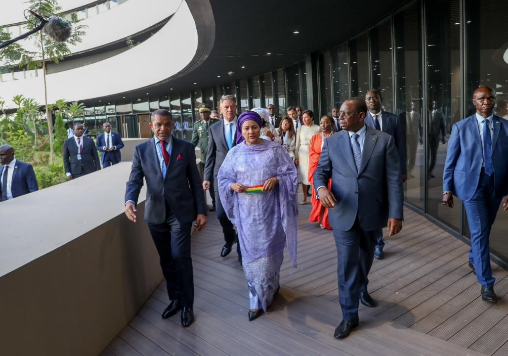 Le Président Sall (troisième à gauche au premier rang), le Président Klaus (premier à gauche au premier rang), la Vice-Secrétaire générale Amina (quatrième à gauche au premier rang) et les autres invités distingués, etc. ont coupé le ruban du projet