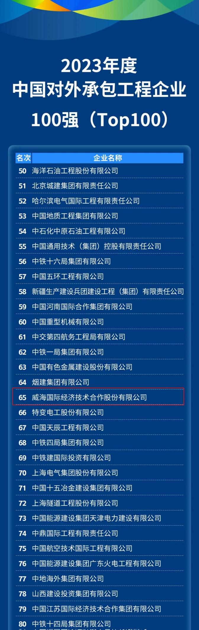 L'Entreprise a été sélectionnée dans de nombreuses listes, notamment dans ''Top 100 des entreprises chinoises des travaux à l'étranger en 2023''.