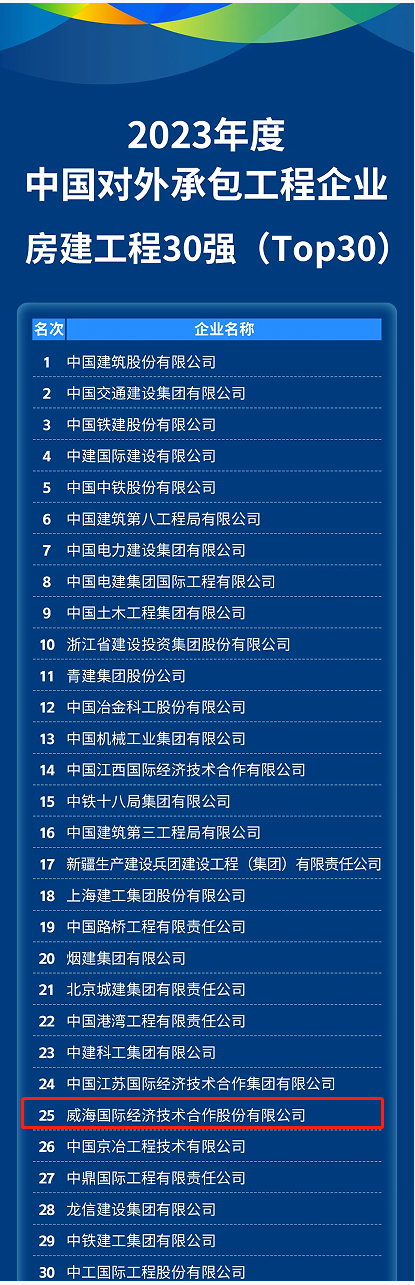 Le 7 mai, lors de la Conférence sur le développement de l’industrie d'entreprise des travaux à l’étranger 2024, la Chambre de commerce chinoise d'entreprise des travaux à l’étranger a publié plusieurs classements des entreprises chinoises des travaux à l'étranger en 2023. L'Entreprise a été sélectionnée avec succès dans Top 100 des entreprises chinoises des travaux à l'étranger, Top 30 des travaux de construction des batiments et Top 30 des affaires dans la région africaine, se classant respectivement 65ème, 25ème et 25ème, ce qui reflète une fois de plus la force croissante sans cesse de l'Entreprise en matière de développement à l'étranger.