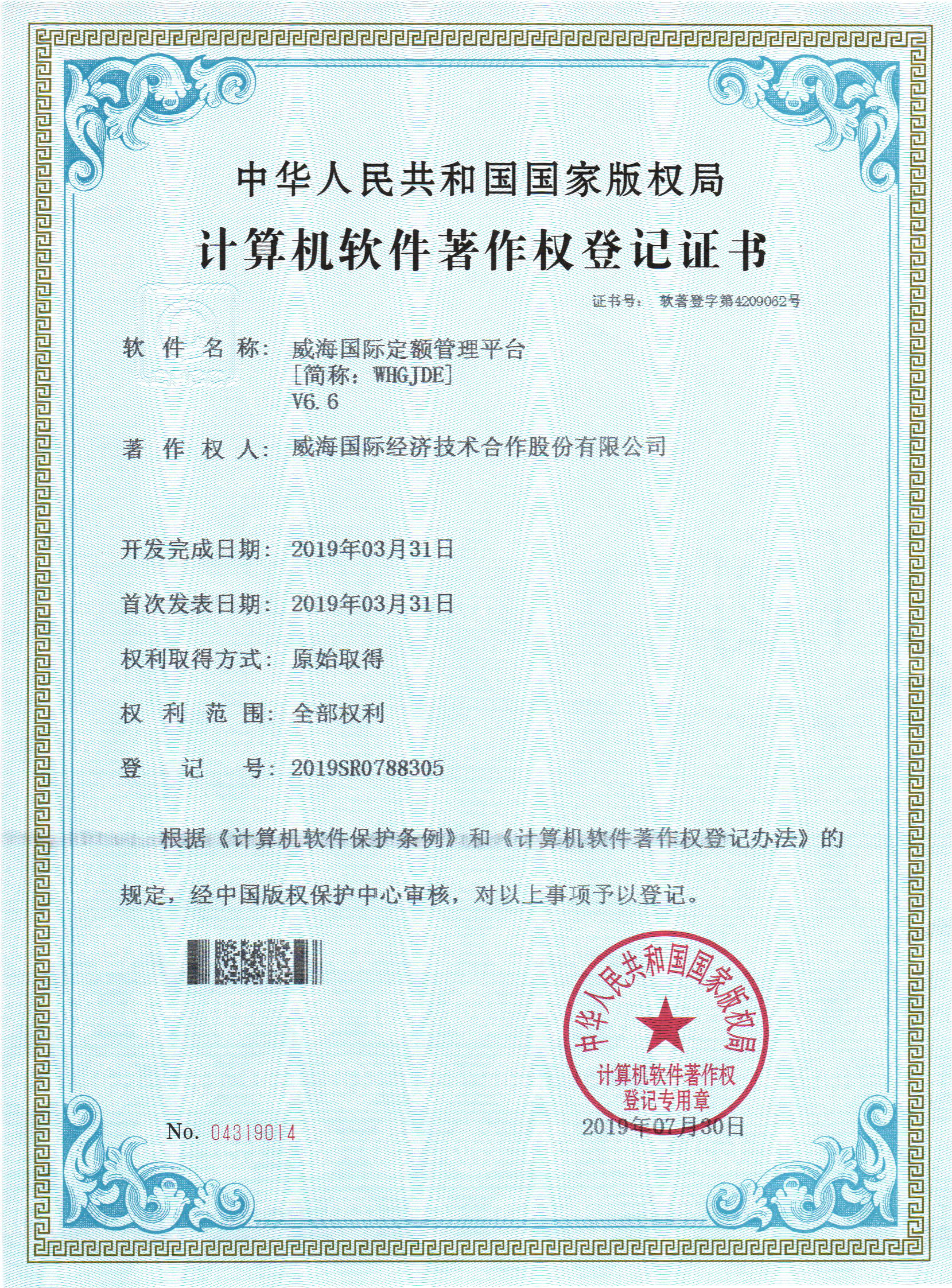 近日,威海國(guó)際企業(yè)定額管理平臺(tái)喜獲《中華人民共和國(guó)版權(quán)局計(jì)算機(jī)軟件著作權(quán)登記證書》(證書號(hào):軟著登字第4209062號(hào))。