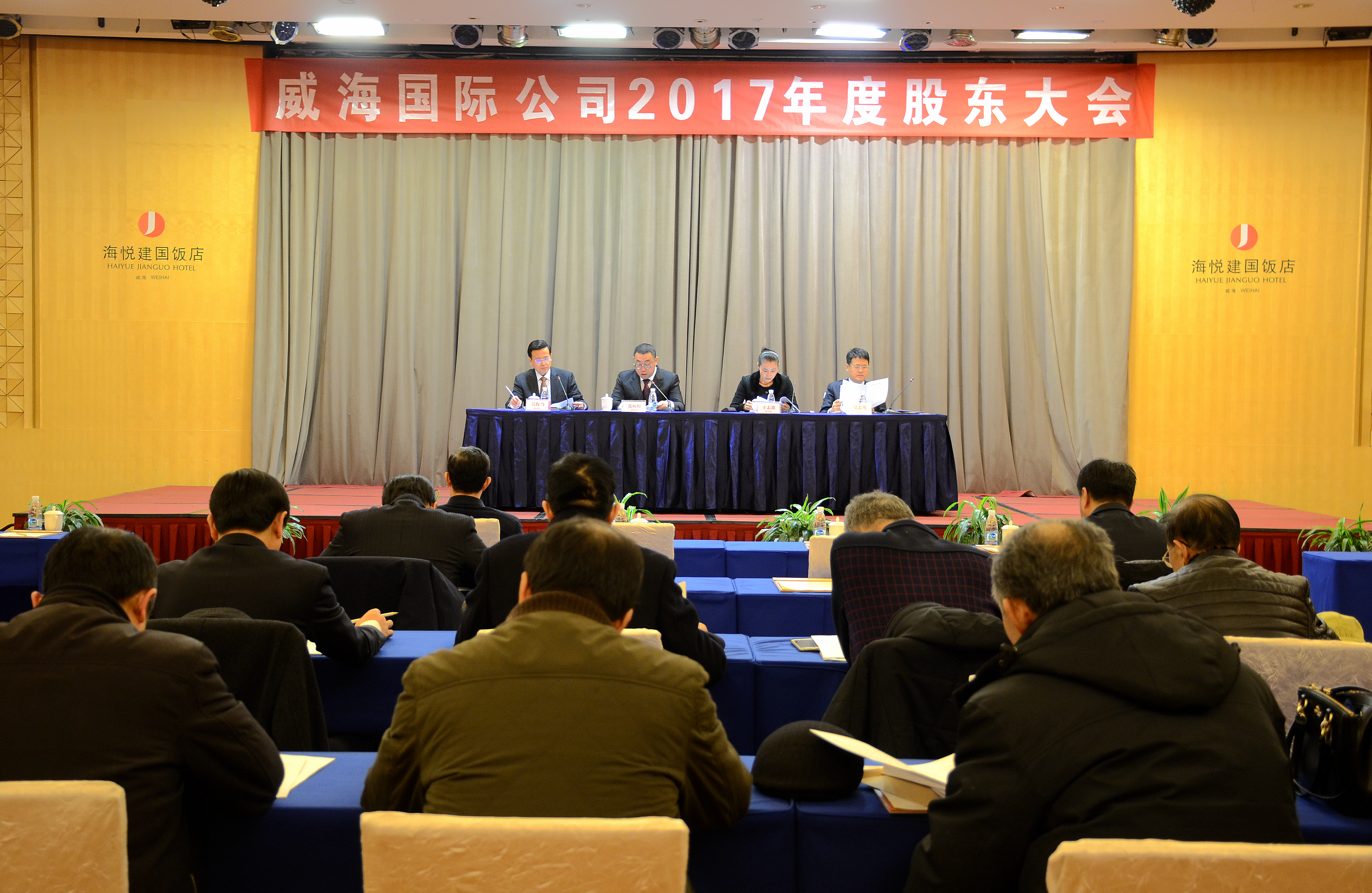 1月26日上午,公司2017年度股東大會(huì)在威海海悅建國(guó)飯店召開。公司股東及委托代理股東共40人出席了大會(huì),參會(huì)股東所持股份占公司總股本的81%。大會(huì)由公司黨委書記吳得當(dāng)主持。